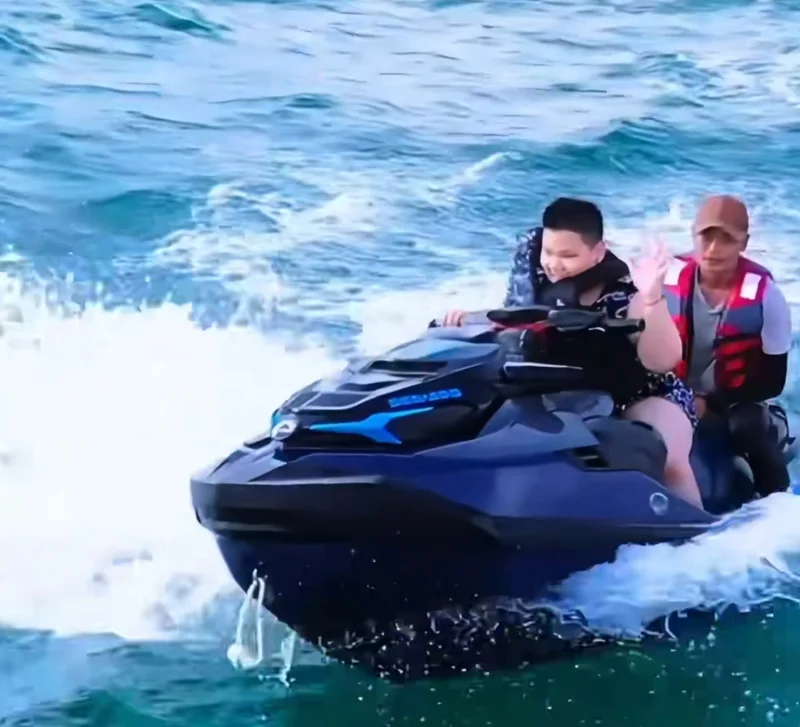 10岁的郭汾阳,被王惠捧在手心宠着。暑假的时候会去三亚冲浪,他骑摩托艇的样子太帅了,还单手掌握方向盘,胆子超大。
