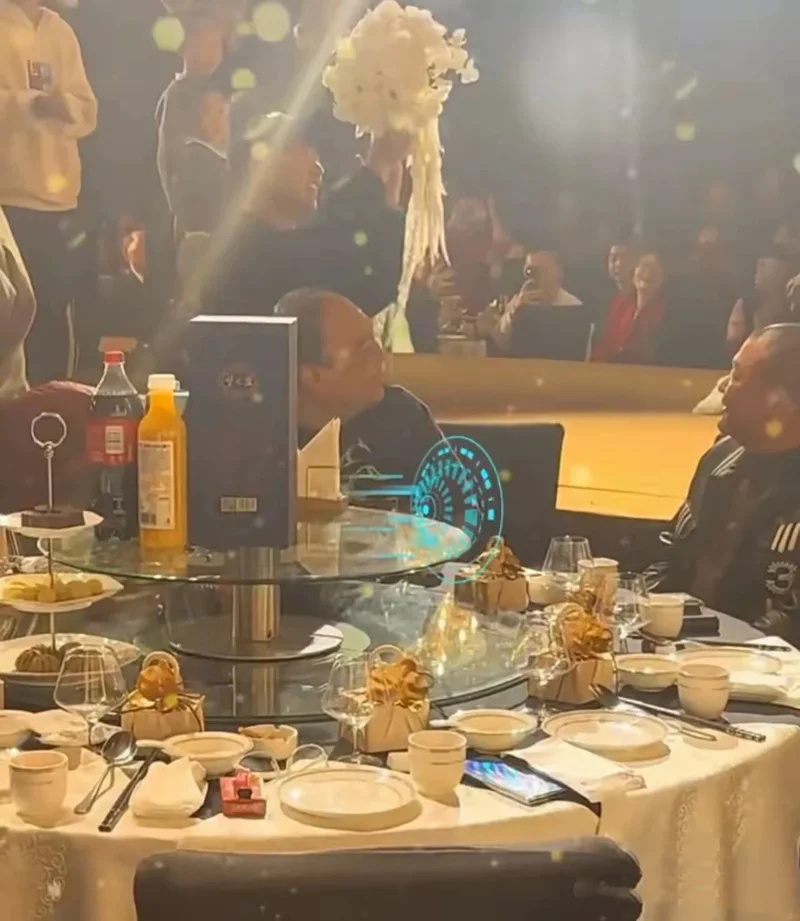 这场婚礼的盛大隆重,宴席的规格也蛮高,桌上摆着白酒、饮料、还有红酒杯,现场有很多亲朋好友特别热闹。