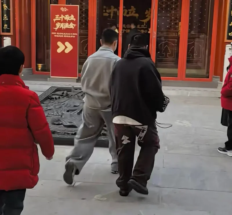 郭汾阳一脸横肉,长势真的太喜人了。他走路甚至有点摇摇晃晃的,被穿浅灰色运动套装的男子牵着手,搀扶着走台阶。