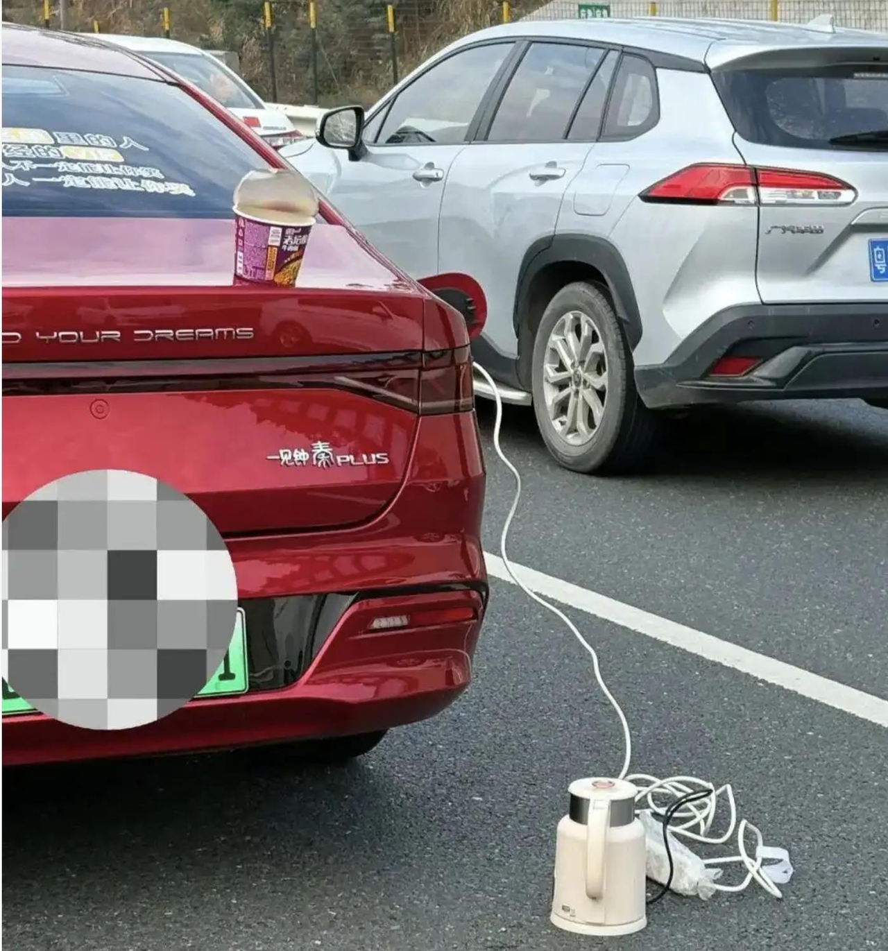 中国民众春节前自驾返乡,由于塞车太久,有人在高速公路的车阵里煮开水方便面。(环球网)