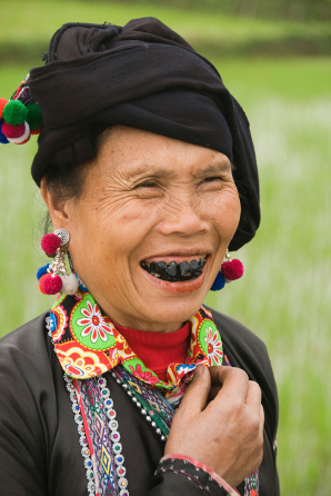 一位现代越南北部女性露出她那被熏黑的牙齿,笑容灿烂。图片来源:Dave Stamboulis