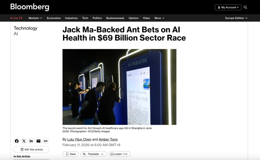 2月11日,彭博社(Bloomberg News)发布深度报道指出,在全球医疗人工智能(AI)的竞技场上,中国正凭借政策红利、科技巨头的深度参与以及庞大的用户基数,展现其技术优势。以蚂蚁集团旗下的AI健康助手“蚂蚁阿福”为例,中国科技企业正通过“AI医生分身”等前沿技术,对规模达690亿美元的医疗健康赛道发起冲击。