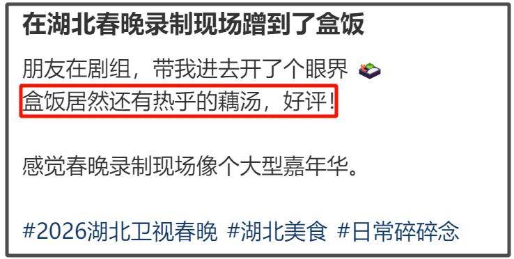 还有网友夸赞湖北春晚盒饭还有热乎的藕汤,剧组演员的盒饭规格也是很高了。
