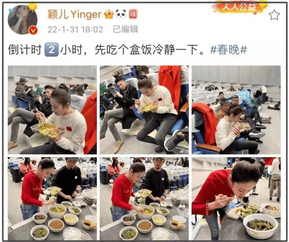 其实春晚彩排非常忙碌,一晚上几十个节目,忙来忙去,有时候吃饭都赶不上热乎的,也怪不得网友看到湖北春晚有热汤会给好评了。春晚彩排忙起来的时候,不管是明星还是主持人,基本都是在吃盒饭。网友扒出往年明星参加春晚彩排的幕后照片。