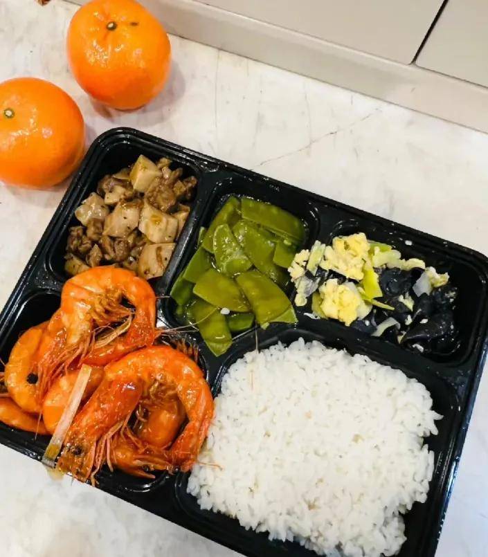 没有桌子,就端着吃,菜色也很丰盛,不仅有盒饭,还有大碗菜。