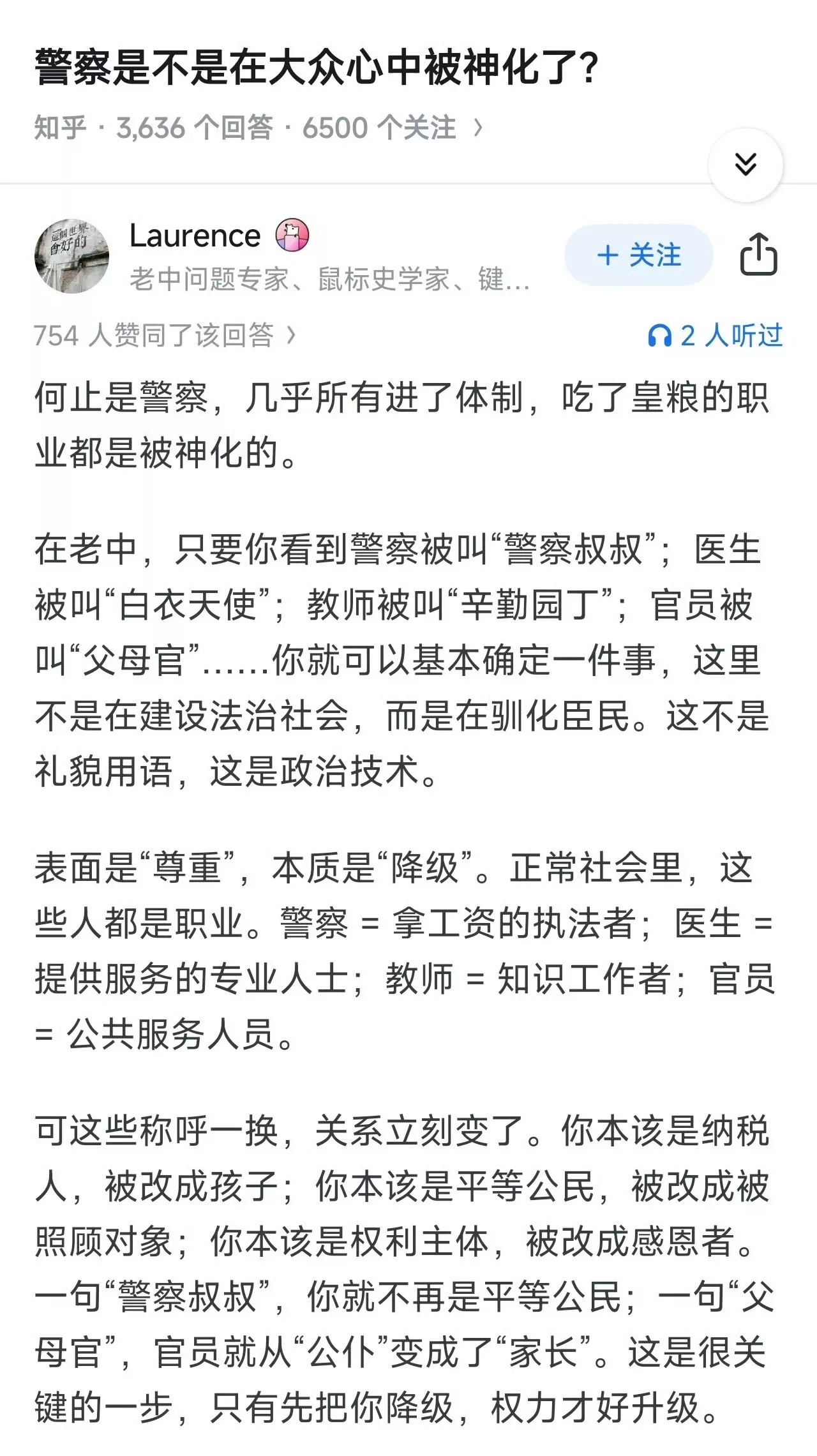 为什么这件事很重要?因为称呼决定关系,关系决定权力。只要你还在叫"警察叔叔"、"白衣天使"、"父母官"……那你就默认了一个前提,你不是公民,你是孩子。一个把人民当孩子的国家,永远不会真正民主;一个把官员当父母的社会,永远不会真正法治。