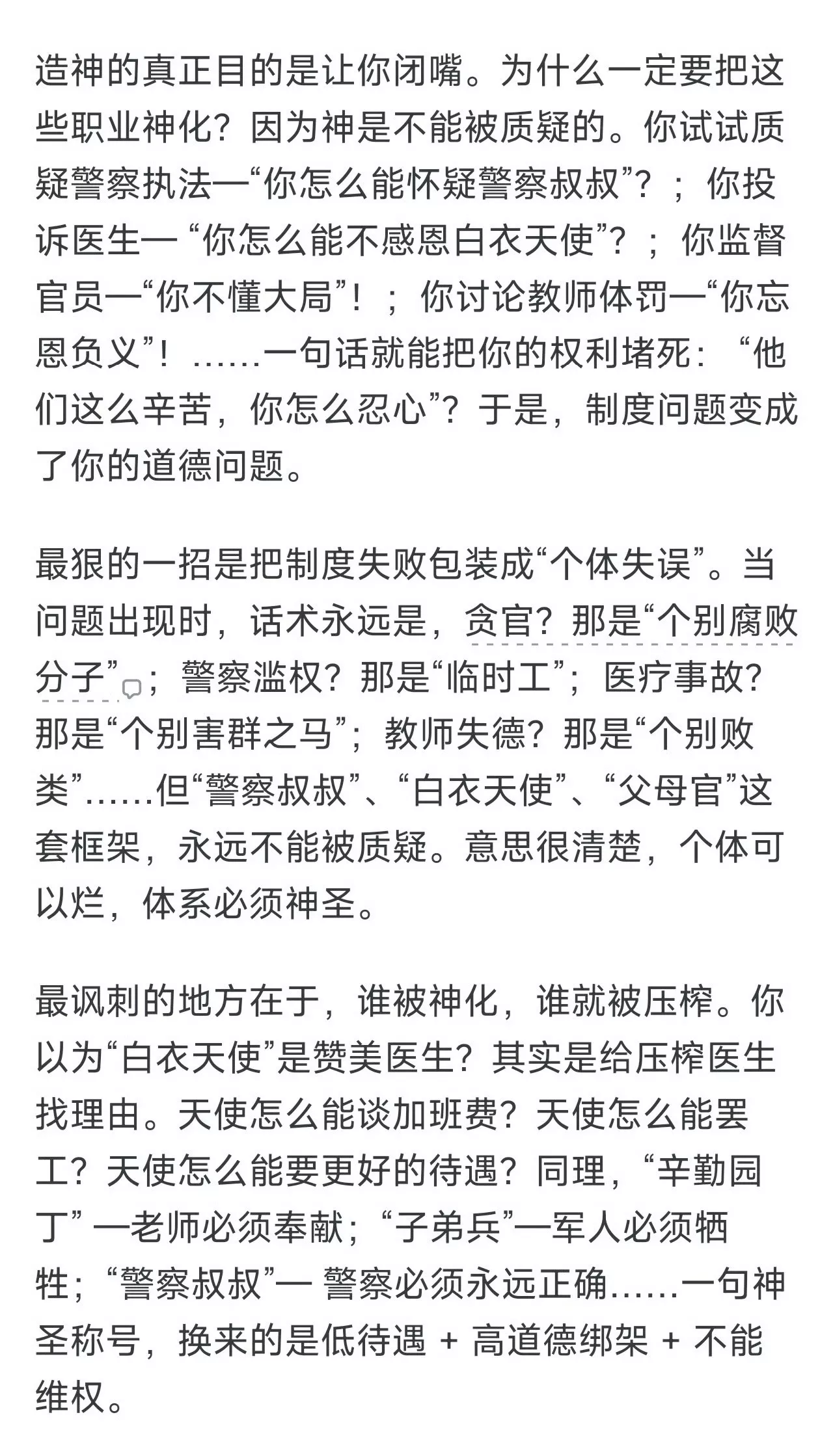 最狠的一招是把制度失败包装成"个体失误"。当问题出现时,话术永远是,贪官?那是"个别腐败分子";警察滥权?那是"临时工";医疗事故?那是"个别害群之马";教师失德?那是"个别败类"……但"警察叔叔"、"白衣天使"、"父母官"这套框架,永远不能被质疑。意思很清楚,个体可以烂,体系必须神圣。
