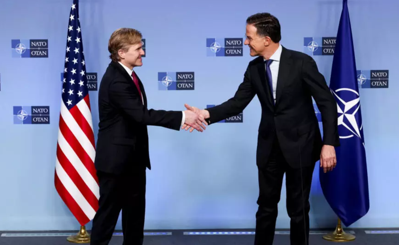 2026年2月12日,北约秘书长马克·吕特在比利时布鲁塞尔北约总部出席北约国防部长会议时,与美国国防部负责政策的副部长埃尔布里奇·科尔比握手。 © 路透社供图