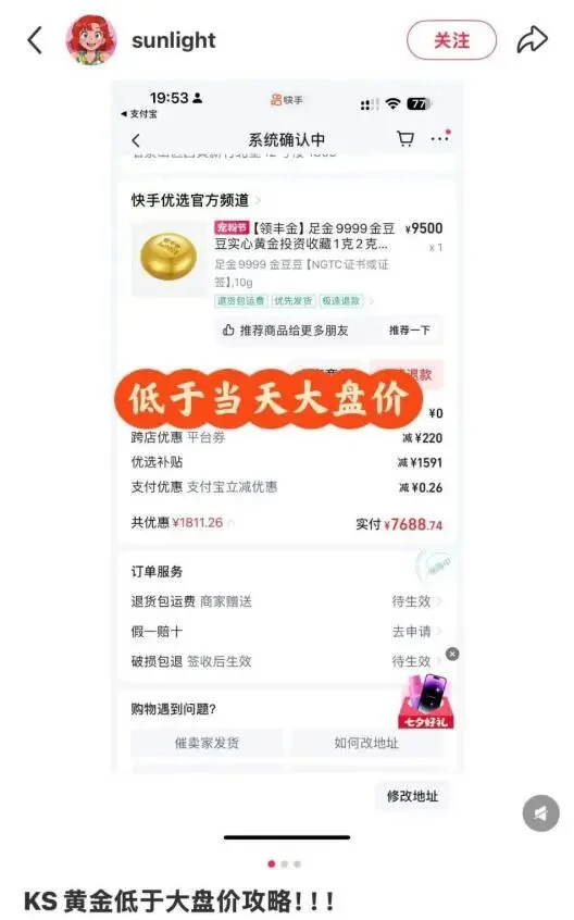 有网友利用平台补贴,在直播间购入低于当天大盘价的金豆。