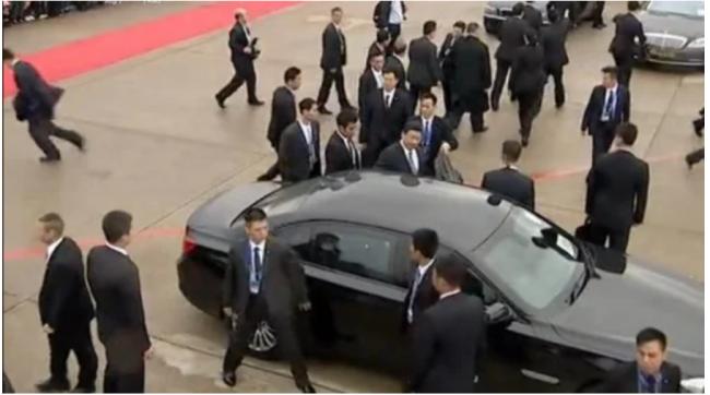 2014年习近平乘车前往澳门半岛。PLA中央警卫团(俗称“中南海保镳”)里三层外三层,严密护卫。(图片来源:视频截图)