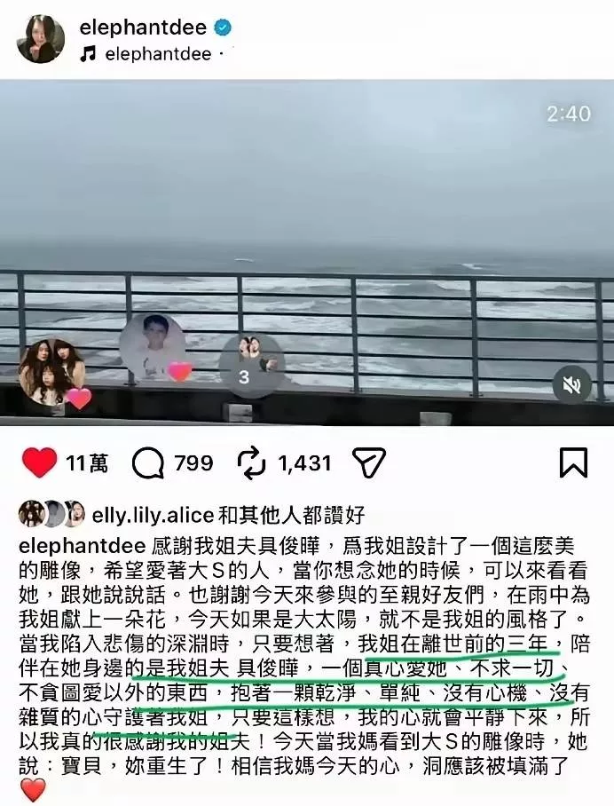 她觉得自己姐姐大S在离世前的三年,有姐夫具俊晔深情的爱、不计回报地付出和陪伴,才能度过人生中最幸福的三年。