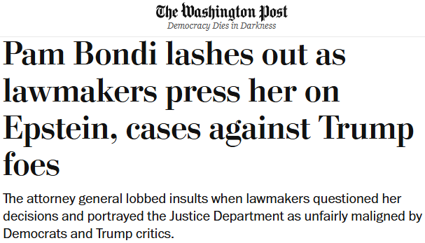 司法部长帕姆·邦迪周三在众议院接受议员质询时,以强硬态度为其在司法部的领导工作进行辩护。此前,她因在发布爱泼斯坦档案一事上处理不当,以及利用美国最强大的执法机构来响应总统川普的号召起诉他的政治对手而受到严厉批评。