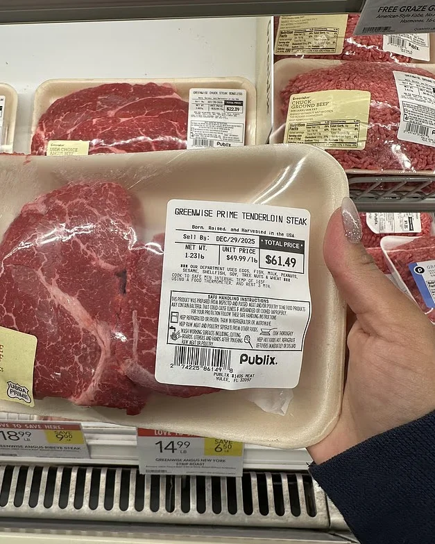 此前,一名顾客在佛州 Yulee 的 Publix 门店拍到一块牛里脊,价格高达 61.49 美元,折合 49.99 美元一磅。照片同样在 Reddit 上引发热议。发帖者写道:“这简直离谱。不仅肉质普通,价格还高得惊人。Publix 到底怎么了?而且这还是货架上唯一的一块牛里脊。”