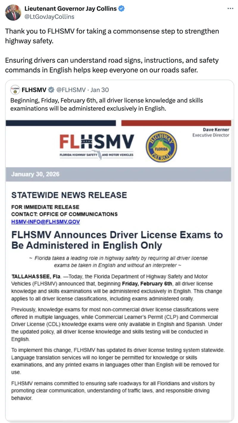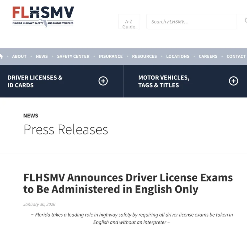 佛州公路安全与机动车辆部(FLHSMV)于1月30日发布官方公告,宣布即刻启动驾照考试英语唯一政策。过去,非商用驾照的知识考试曾提供多种语言版本,而商用车驾照(CDL)考试则限于英语和西班牙语。