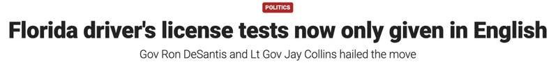 州长德桑蒂斯将此举称为“常识性的改革”,并多次强调英语理解能力与道路安全之间的直接关系。他表示,佛州所有交通标志、道路提示与紧急警示均以英语呈现,司机必须能够准确理解“Stop”“Yield”“School Zone”等关键信息,才能降低事故风险。多位州政府官员也指出,统一考试语言不仅有助于提升道路安全,也被视为推动新移民加快融入社会的重要一步。