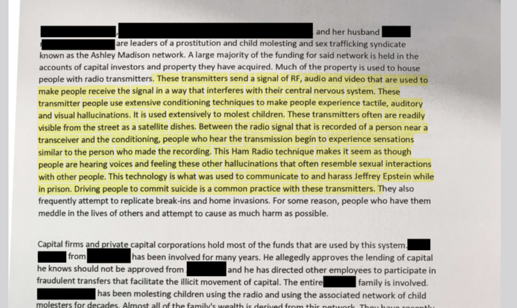 该检举信函还指称,该组织透过不动产投资与资本运作取得资金,在纽约(专题)多处公寓设置RF发射设备,据称可透过无线电讯号对受害者造成幻觉与心理干扰,用于精神操控与骚扰,与多起精神崩溃及自戕事件有关,文件亦指称部分房产用于存放非法影像与洗钱,还涉及金融界与艺术界极具资产的人士。