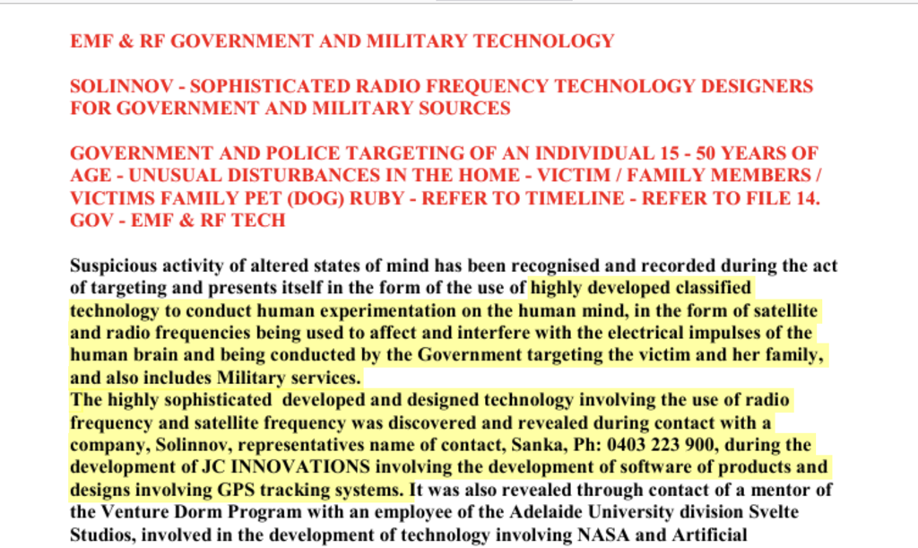 该文件的其中一项主要指控,是所谓「政府与军方使用高阶无线电波技术」对个人住家进行远端干扰与监控,报告称相关技术侵犯隐私,并且造成精神压力,并与一份名为「Solinov Report」的软体开发文件相关,声称这份报告就是相关技术能力来源,文件也将这些内容描述为长期、有组织的跨国迫害行动。