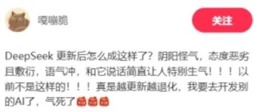 另一位网友也发帖吐槽:“DeepSeek更新成傻子了吧!写的东西文绉绉、一惊一乍,比十几年前的青春伤感文学还尴尬,本来就爱用它瞎唠嗑,再不改回来,真的要卸载跑路了!