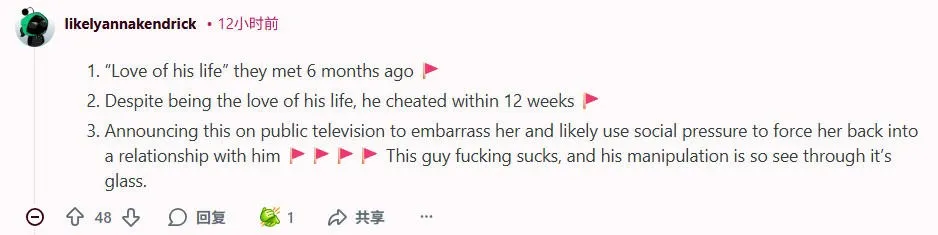 更有锐评:“我尊重他试图用拍浪漫喜剧的方式求复合,但哥,这是现实生活。”