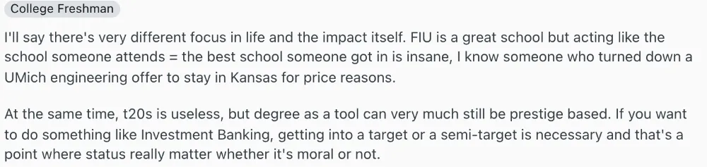 但与此同时,他也承认一个残酷现实,T20大学学位确实能提高进入投资银行、公司法等精英领域的成功率。FIU本身不丢人,但在这些行业「出身不高」确实是硬伤。