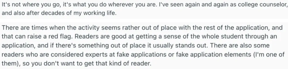他还透露了一个招生内幕,大学招生官团队中有专门识别包装型的虚假申请专家,很多看似精巧的曲线救国路径,其实一眼就能识破。