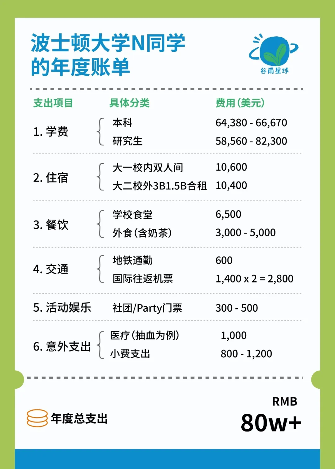 整体看下来,美本留学生基本每年大致支出在70-80W人民币左右。