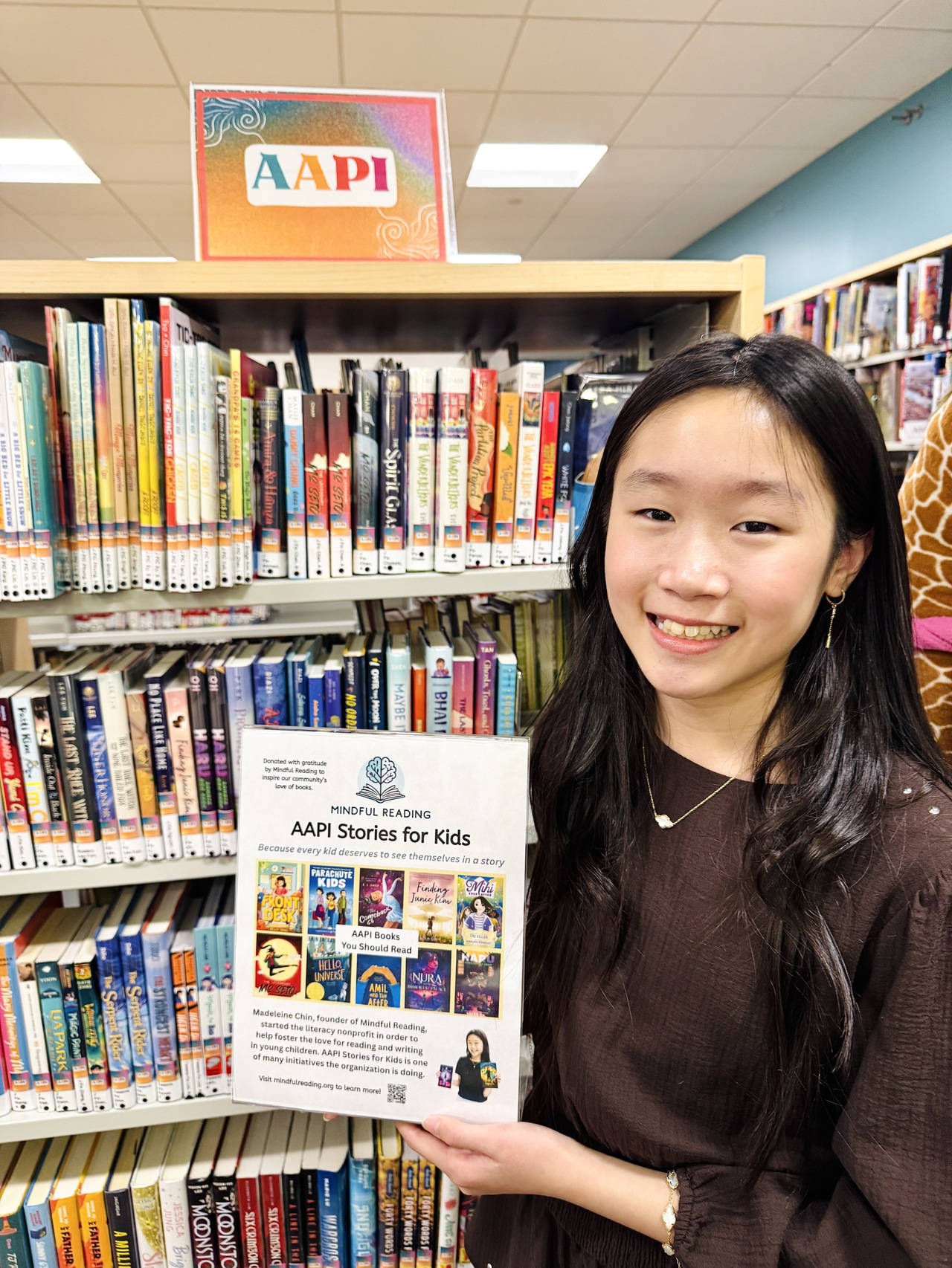 长岛大颈南初的13岁华裔女生金嘉雯发起「亚裔童书故事计画」(AAPI Stories for Kids),与图书馆与学校合作设立专属亚裔童书书架与推荐书单。(受访者提供)