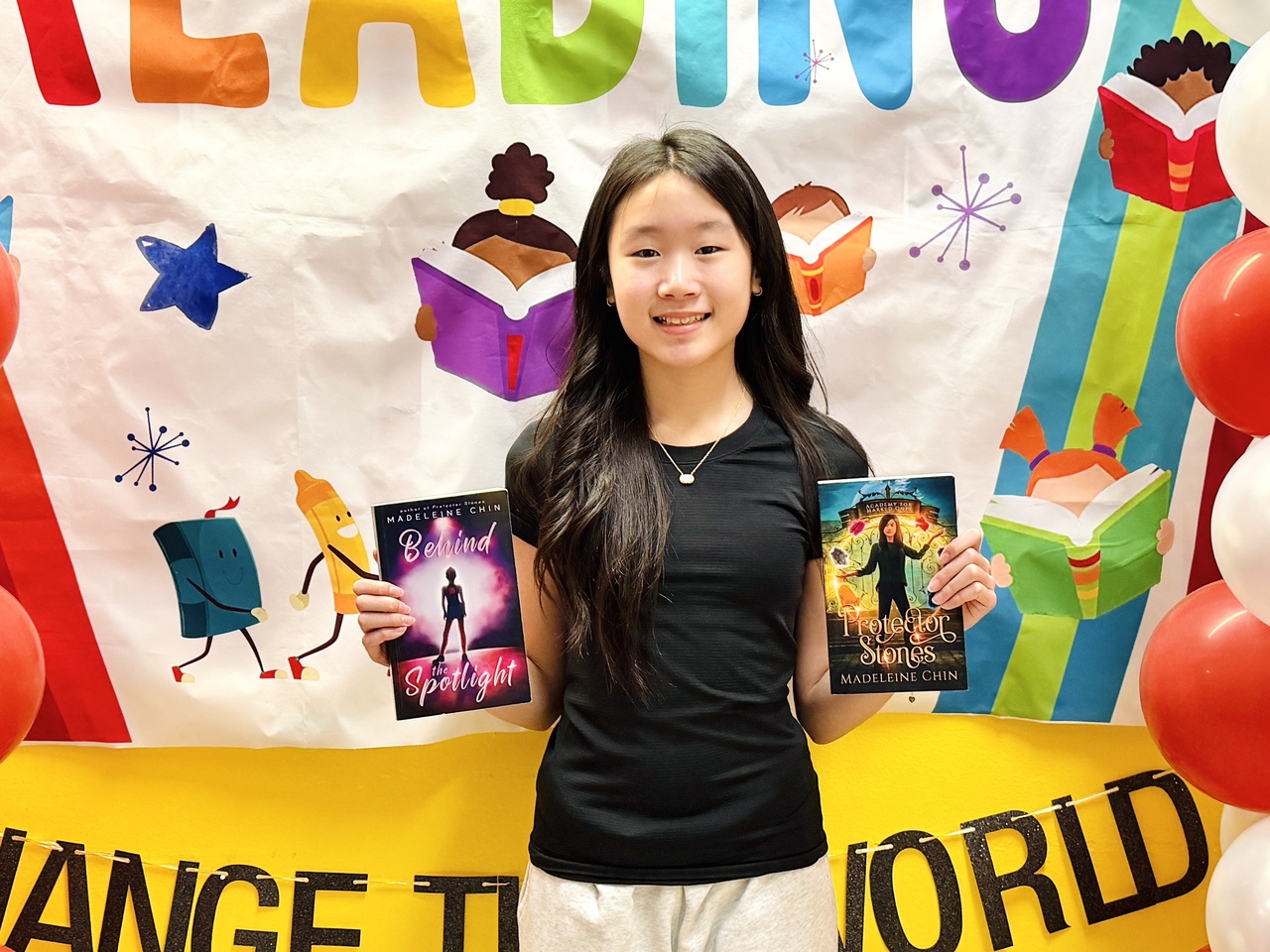 大颈南初的13岁华裔女生金嘉雯已经出版两本英文小说。(受访者提供)