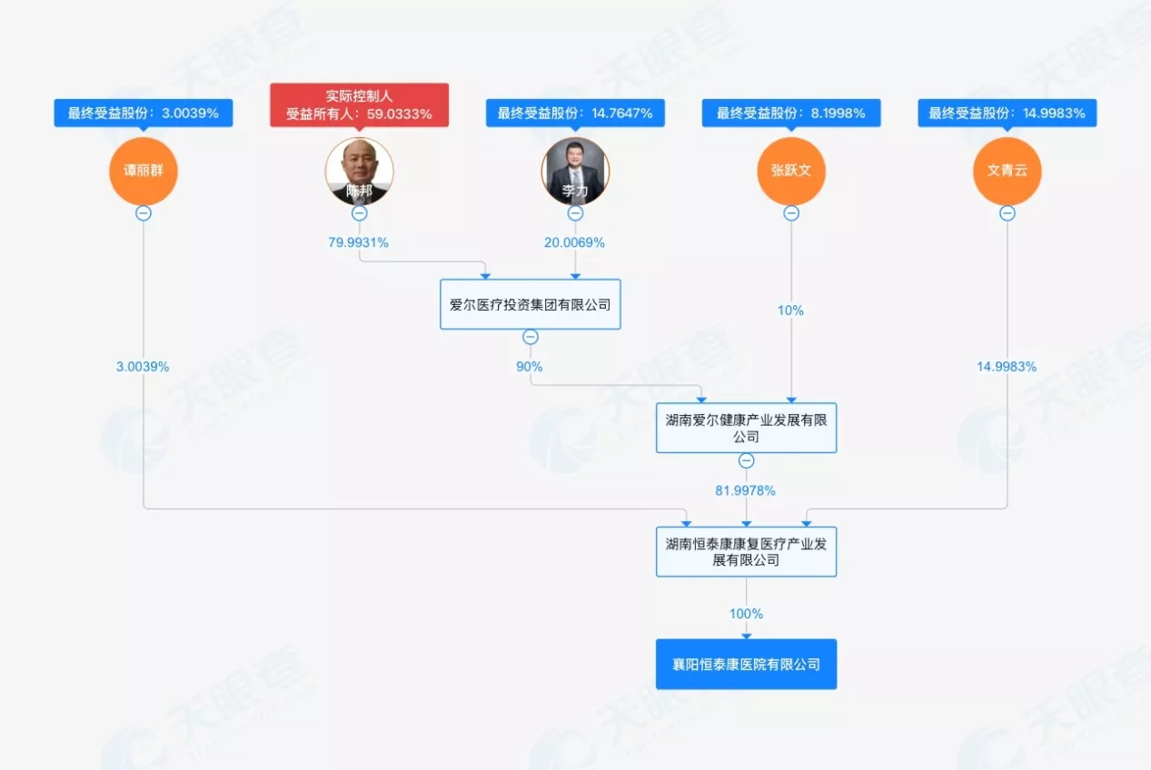 股权信息显示,爱尔医疗投资的股东分别为陈邦和爱尔眼科的副董事长李力,两人分别持股约80%和20%。股权穿透后,襄阳恒泰康的最终受益人为陈邦,最终受益股份为59.0333%。