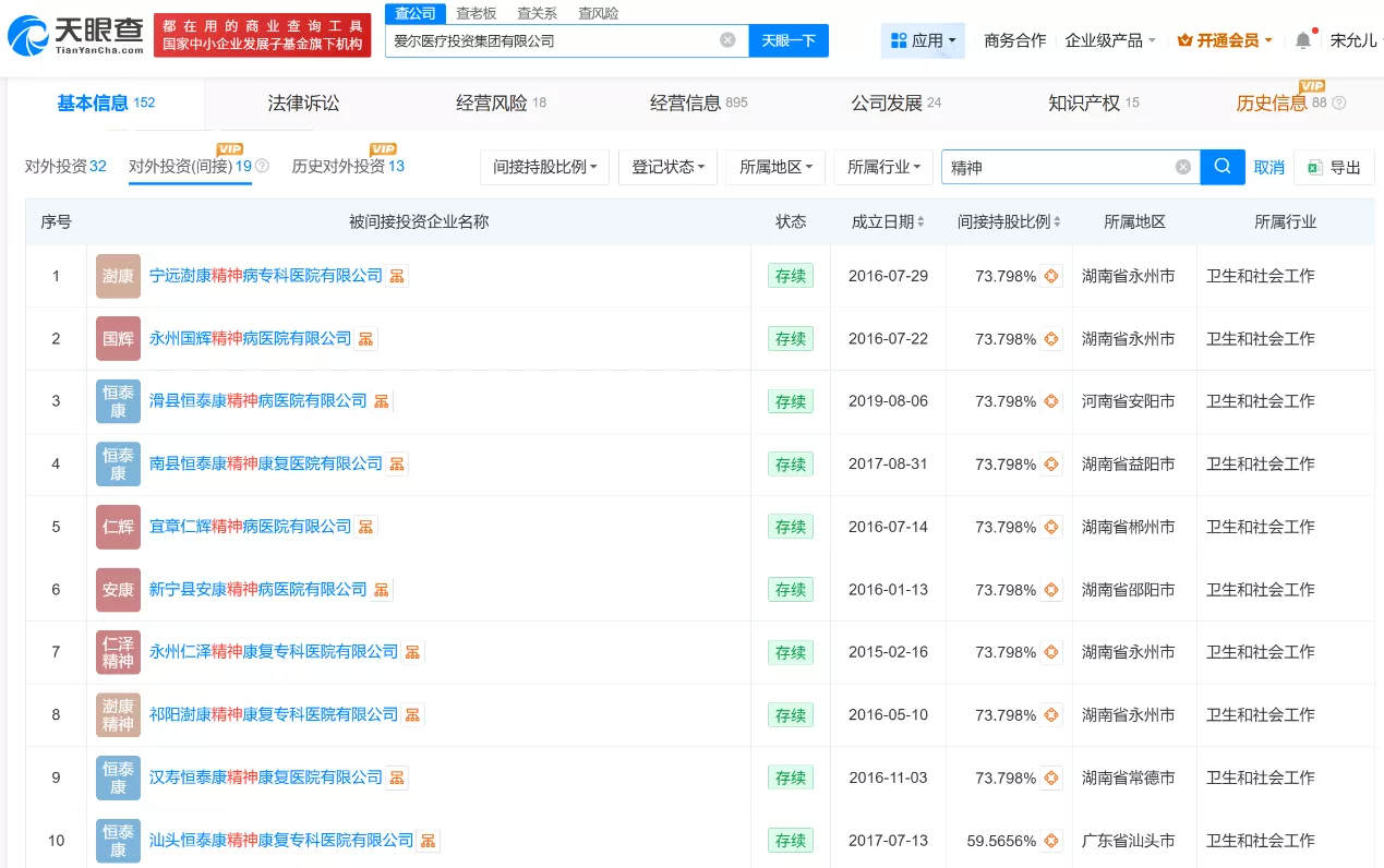 《BUG》栏目查询发现,2015年至2019年期间,湖南恒泰对外投资了多家精神病或精神康复医院,由于爱尔医疗投资与湖南恒泰康存在股权关系,目前除了襄阳恒泰康外,爱尔医疗投资仍间接持有约15家精神病康复医院的股权,持股比例从10%至70%不等,而这些医院的最终受益人同样指向陈邦。
