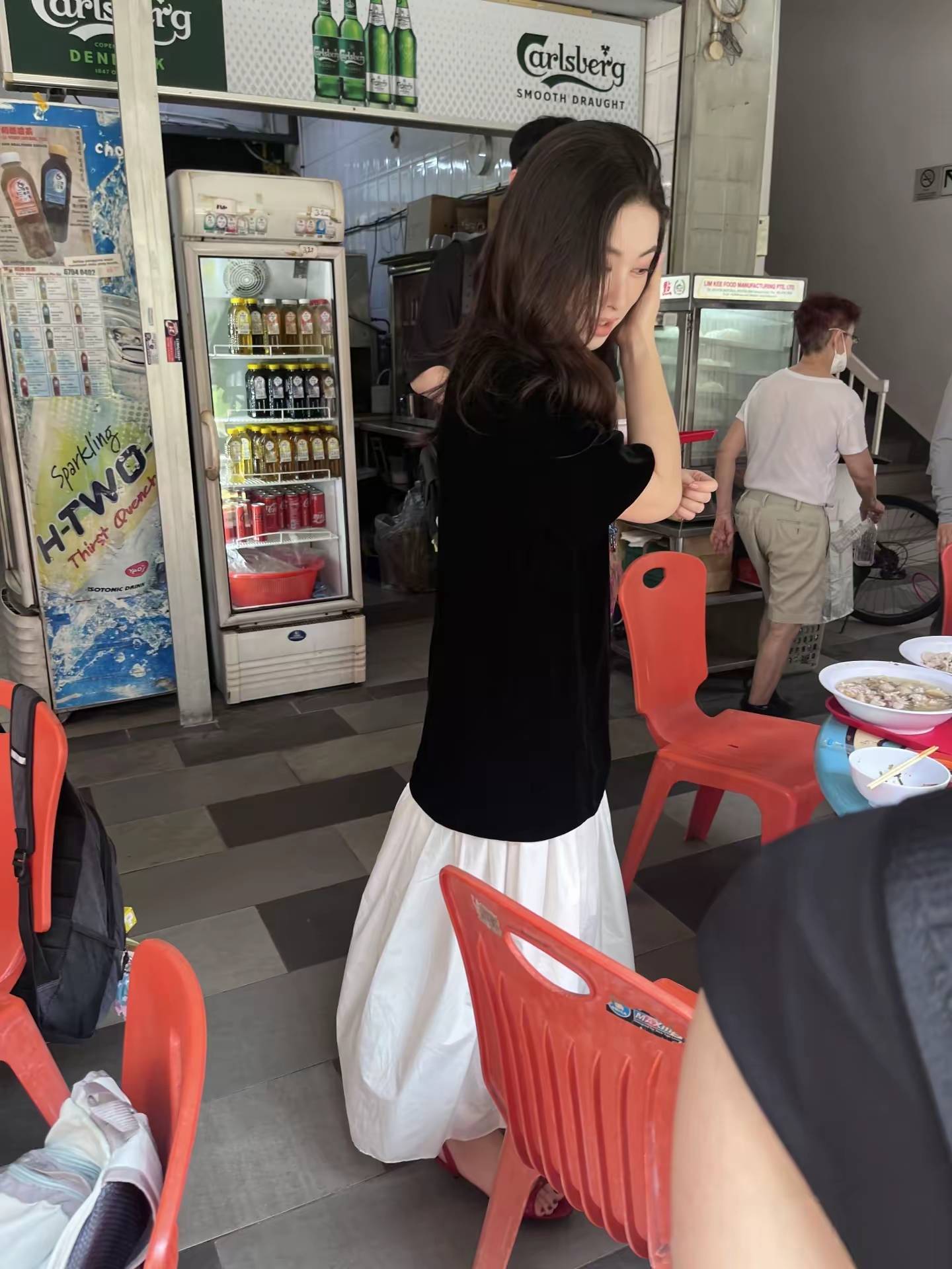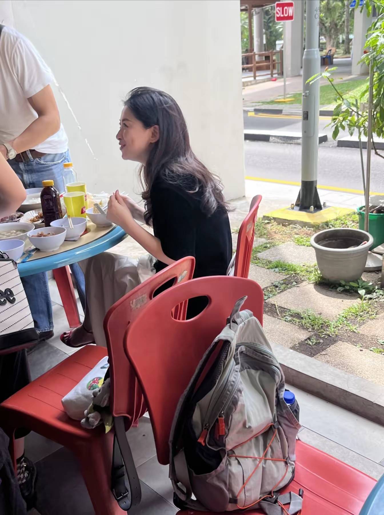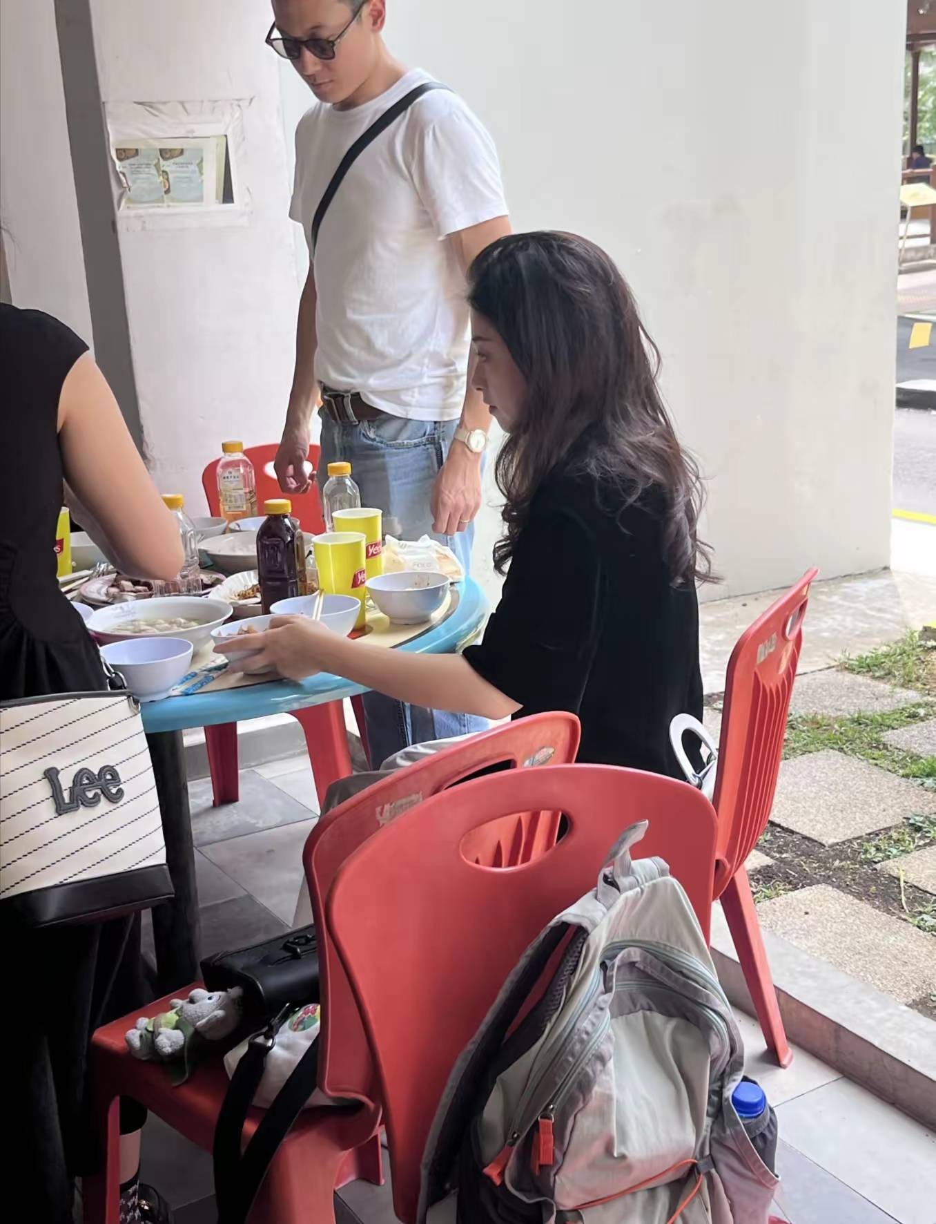 彼时正午的本地排档,朱珠裹着宽松的白色棉麻裙,赤足踩一双编织凉鞋,微卷的长发随意搭在肩后。没有浓妆,没有定制礼服,41岁的她皮肤透着自然光泽,和身边穿白T牛仔裤的丈夫王昀佳坐在一起,像极了普通夫妻逛吃的模样。最动人的瞬间落在丈夫手里的相机:他悄悄抬着镜头对准埋头吃叻沙的朱珠,嘴角的笑藏不住,眼睛里的光比街对面的阳光还暖——那不是镜头前的刻意营业,是藏在烟火气里的“被爱时刻”。