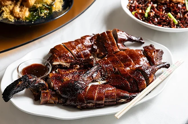 招牌北京烤鸭在你桌边现包,热薄饼配亮晶晶的鸭皮。