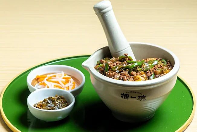 拿起石杵,把饭当场捣成泥。可能是猪肉碎配红烧茄子,也可能是来自中国东北的五常米。