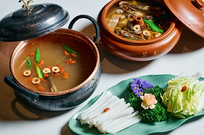 扇贝、泥蟹、虾饺泡在金黄鸡汤里,细致到不行。