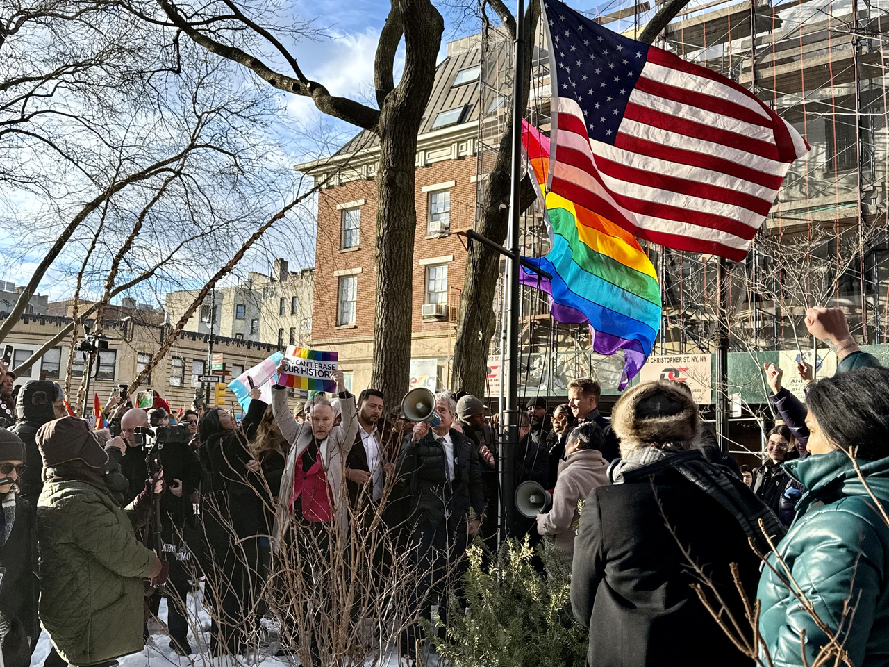 民选官员和民意代表齐聚曼哈顿石墙国家纪念碑重升彩虹旗,抗议川普政府撤旗决定。(记者刘梓祁/摄影)
