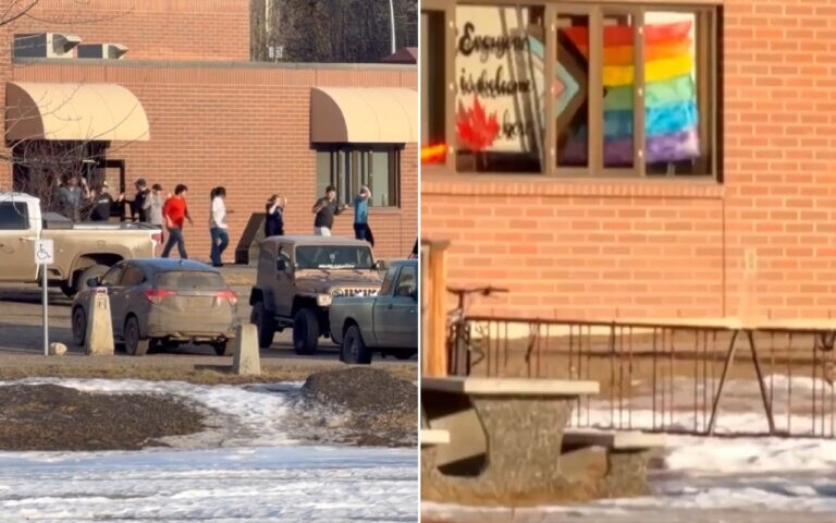 现场视频显示,学校一扇窗户上悬挂着一面大型同性恋“骄傲”旗帜。