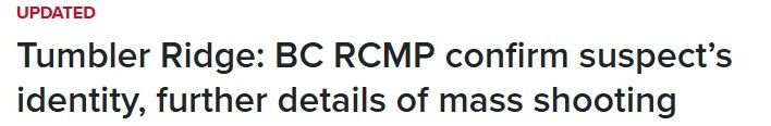 卑诗省皇家骑警(BC RCMP)已确认一名涉嫌实施周二下午在卑诗省东北部小社区Tumbler Ridge发生的大规模枪击案的嫌疑人。该事件造成8人死亡,多人受伤。