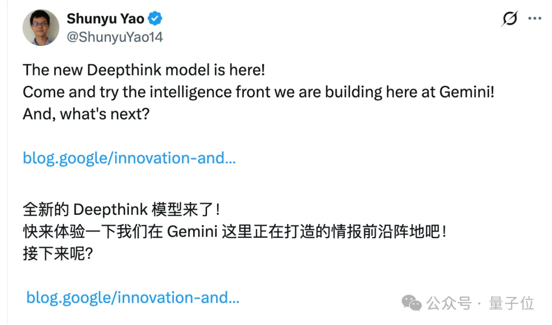 另一位“尧舜禹”——清华物理系传奇特奖得主姚顺宇(Shunyu Yao),去年9月加入谷歌DeepMind,也是这次Deep Think新模型的参与者。
