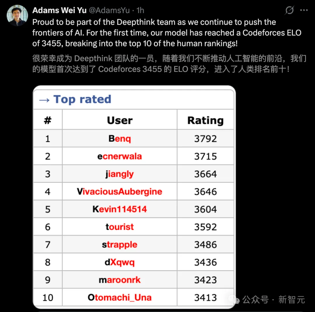 在编程界,它刷出了3455 Elo的惊人分数,达到世界冠军级的水准,冲入了Codeforces比赛人类TOP 10!