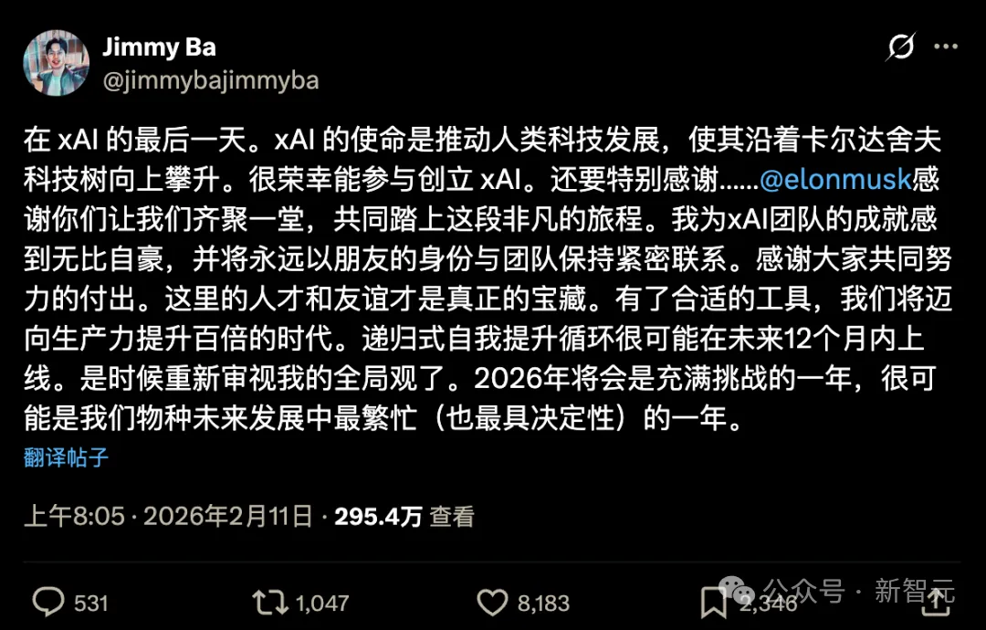 同一天,xAI 联合创始人 Jimmy Ba 宣布离职,告别帖里写的不像是道别,更像是遗言:「递归式自我提升循环很可能在未来 12 个月内上线。2026 年将会是疯狂的一年,很可能是我们物种未来最忙碌、也最具决定性的一年。」