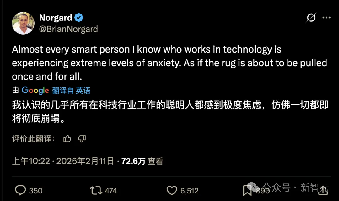 2026 年 2 月 11 日,硅谷连续创业者 Brian Norgard 在 X 上写了一句话:「我认识的几乎所有在科技行业工作的聪明人都感到极度焦虑。仿佛一切都即将彻底崩塌。」
