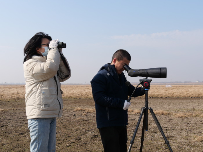 邹业爱(右)和李冬梅在观察候鸟。王昊昊 摄