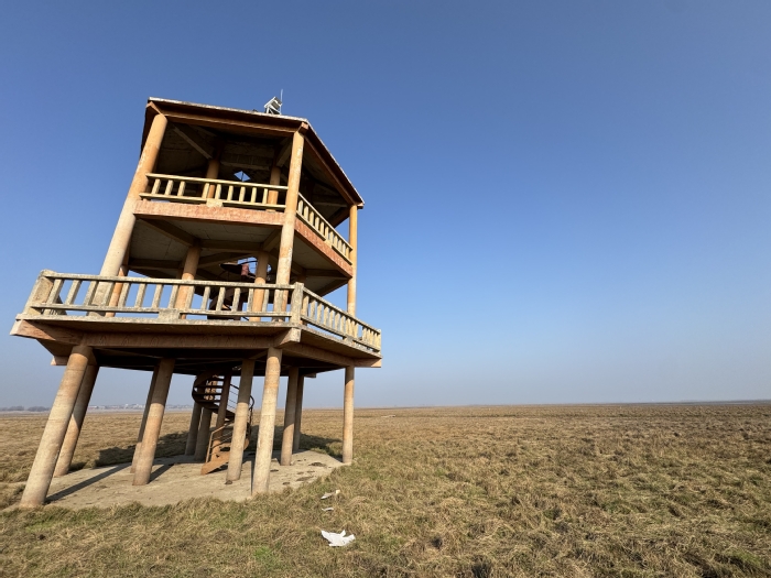 “脚步轻点,否则会惊扰鸟儿。”邹业爱边走边提醒记者。观鸟塔一楼有芦苇等遮挡,风较小。登上三楼,寒风陡然加剧,呼啸声灌满双耳,不一会儿,双手就冻得不听使唤。“这风不算大,湖区一些地方风速最高达到每秒18米左右,无人机都没法用。”