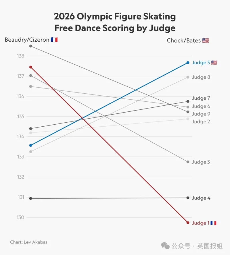 在自由舞项目中,她给法国选手打出了137.45分,是所有裁判中第二高的分数,而给美国选手的评分是129.74分——是唯一一位打分不超过130分的裁判。