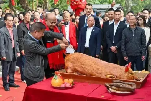 在中国过年,吃团年饭是必不可少的环节。家族中的老者给远道而来的阿迪昂一行派发红包,他也给乡亲们发红包回礼。“新年好!”他还特意现学现用这句粤语,向大家送上祝福。