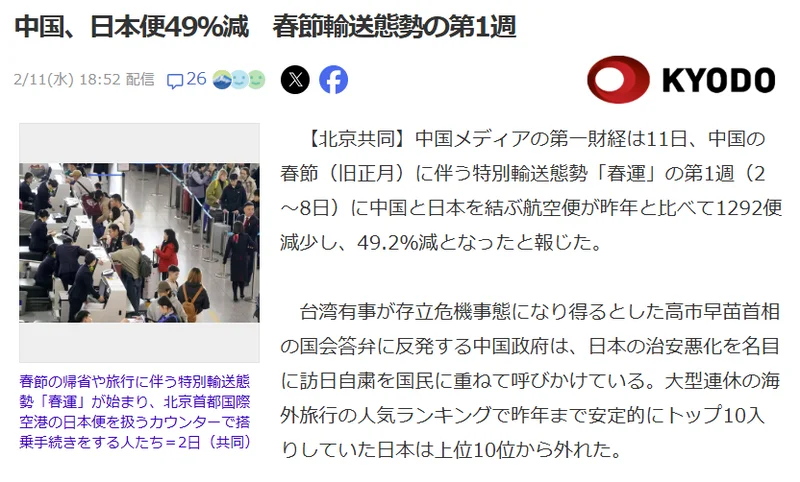 此外,另一项调查显示,春节期间中国游客对日本住宿设施的预订数量较2025年增加约4%。意思也就是说,不减反增了......