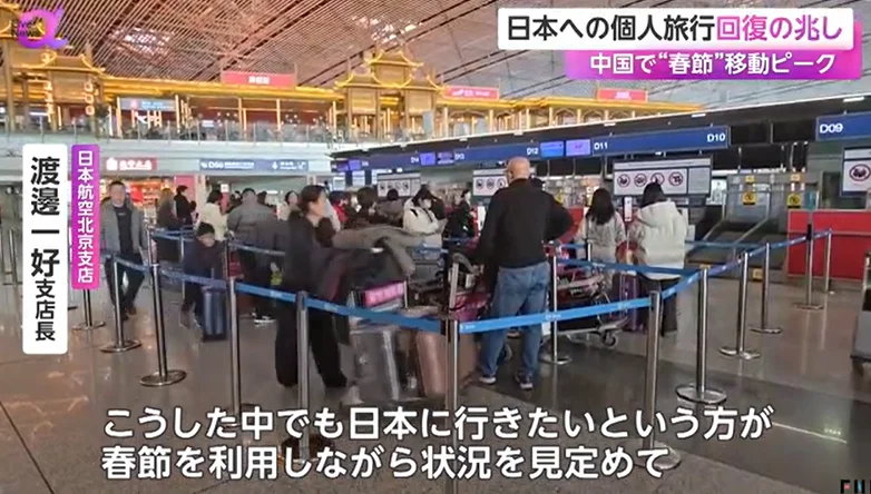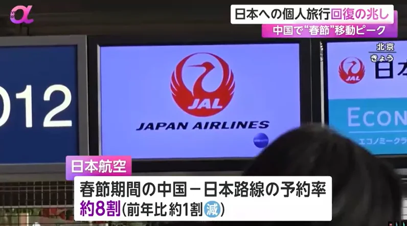 据日本航空方面介绍,春节期间中日航线的预约率约为八成,与上一年相比仅下降约一成。