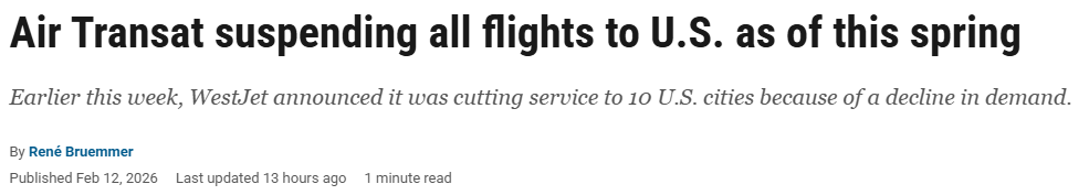加拿大越洋航空(Air Transat)宣布,将于今年春季取消最后两条赴美航线,全面暂停美国业务。