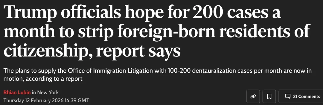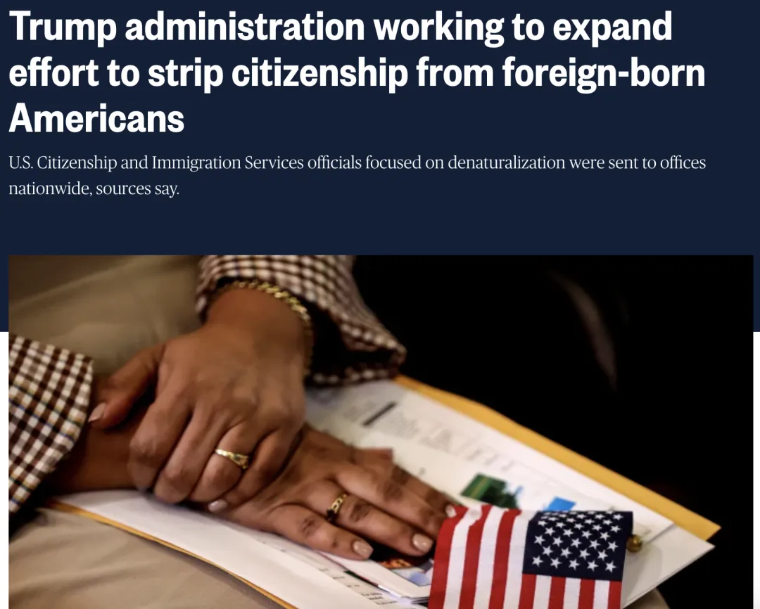 据NBC News和《独立报》(The Independent)报道,特朗普政府正大幅扩大针对“外籍出生美国公民”的国籍撤销(Denaturalization)行动,并已下达了具体的量化指标。