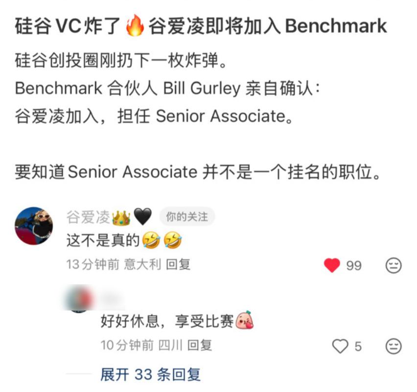 近期,一则所谓“重磅消息”在互联网上流传,指Benchmark传奇合伙人Bill Gurley证实,谷爱凌将入职硅谷风投Benchmark,任资深投资经理(Senior Associate)。